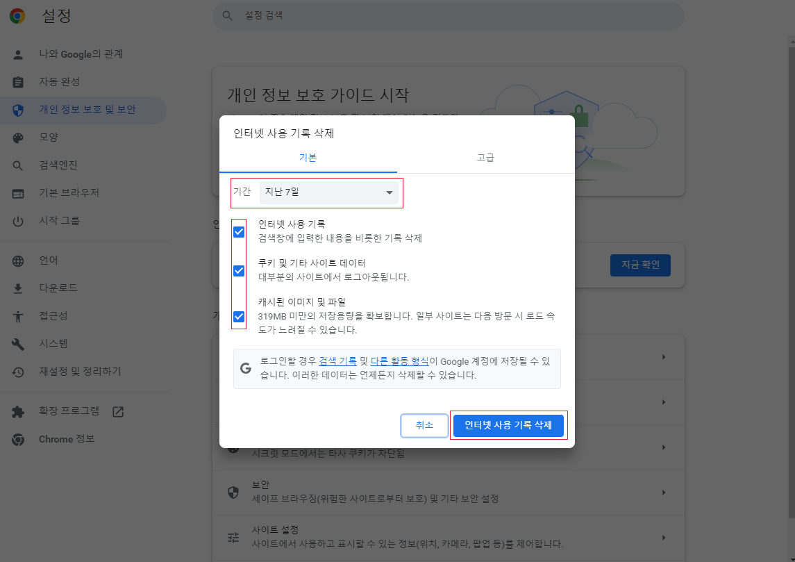 2. 개인정보 및 보안 > 인터넷 사용 기록 삭제 클릭